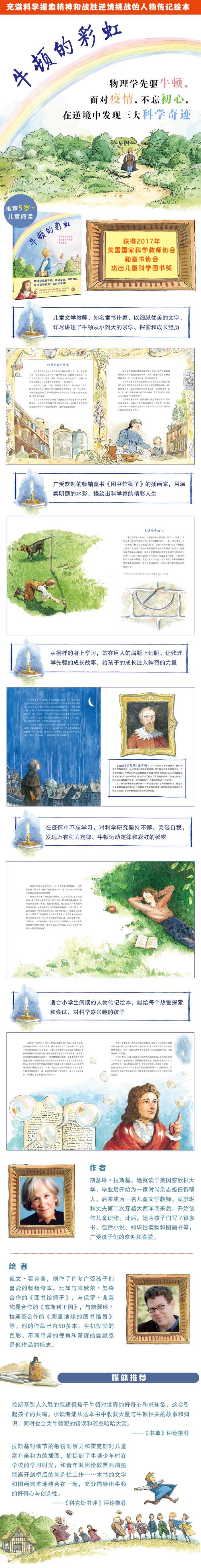 这本图画书以优美的插画、文学的语言讲述了物理学先驱艾萨克·牛顿的成长经历,他景仰的科学家伽利略、开普勒,以及他发现万有引力定律、物体运动规律,以及彩虹的光学构成的经过。 牛顿小时候是一个安静而好奇的小男孩,少年时他就总是在阅读、提问、观察与发明创造。最终,他得以进入剑桥大学,学习和钻研先驱们的科研成果,并在他们研究的终点上扬帆起航。当英国爆发传染性极强的黑死病疫情时,牛顿不得不离开剑桥,回到故乡的乡间,但他丝毫没有放松思考和对物理学的探究,最终在这段期间发现了三大物理学发现——万有引力定律、物体运动规律和彩虹的光学构成。