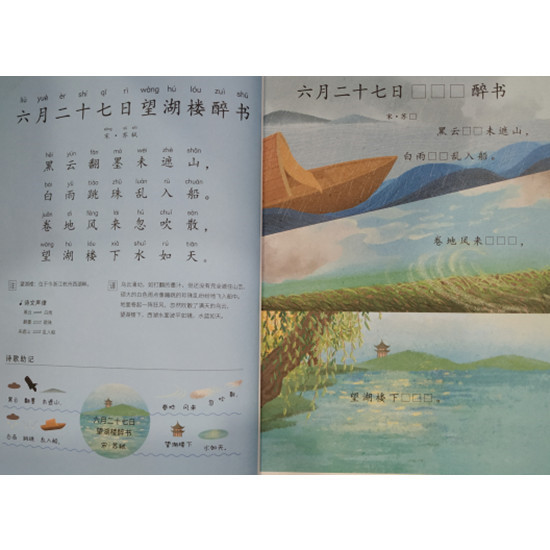 《趣读古诗文》为一套适合小学生及学龄前儿童阅读的经典古诗词、小古文轻松读物。全书共4册,收录广为传诵的经典古诗词和篇幅短小的古文129篇。页面内容包括带拼音的诗文原文、生僻字词解释、译文,诗文声律、诗歌助记、诗文提词等帮助孩子记忆古诗文的小版块,细节丰富的诗意插画、逐句展示古文情节的多格漫画,让孩子更直观地读懂古诗文,诗文相关延伸知识配有趣味漫画,用多种方法帮助孩子学习、理解、记忆、背诵古诗文,培养孩子对古诗文的浓厚兴趣。 诗文正文全篇标注拼音,注释、译文齐备,帮孩子读准字音,理解诗文。诗文声律版块列出诗文中两两相对的字词,帮孩子发现字句特点和规律。诗歌助记图直观呈现诗词结构,充分调动图像记忆力。细节丰富的诗词插画,生动还原古诗词场景。趣味十足的古文小剧场,用漫画分镜逐句展示文言文故事情节,帮孩子更直观地读懂和记忆文言文。漫画版延伸知识则帮孩子建立起...