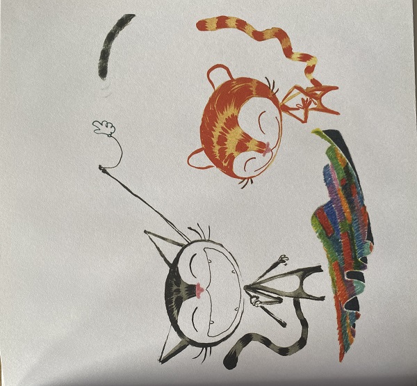 咦,地毯下面有一条小猫尾巴,它会是小灰猫吗?两只小猫用鱼钩掀开看看,真的是小灰猫藏在底下啦。调皮的小灰猫和他们一起玩耍,玩着玩着就让他们俩找不到自己了!
