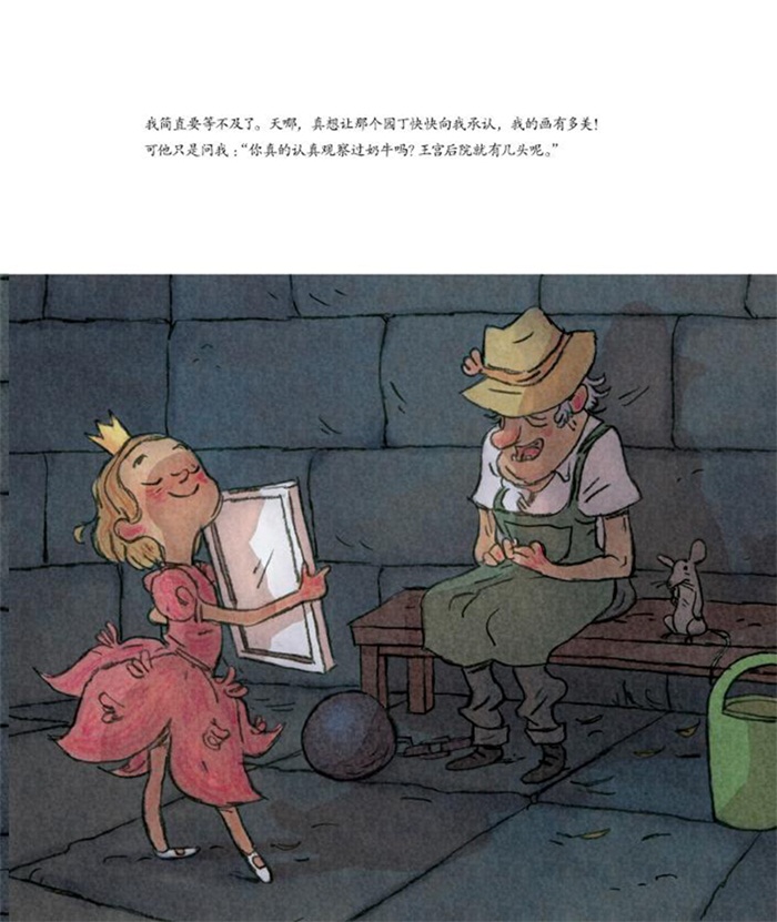 我的画到底好不好?小公主心里终于产生了怀疑。宫里宫外几乎所有的大臣、侍从、女仆都说她画的奶牛无以伦比,可是只有一个园丁,不管怎样都不肯夸她的画有多美!他竟敢反问小公主:“你喜欢自己的画吗?你真的认真观察过奶牛吗?”