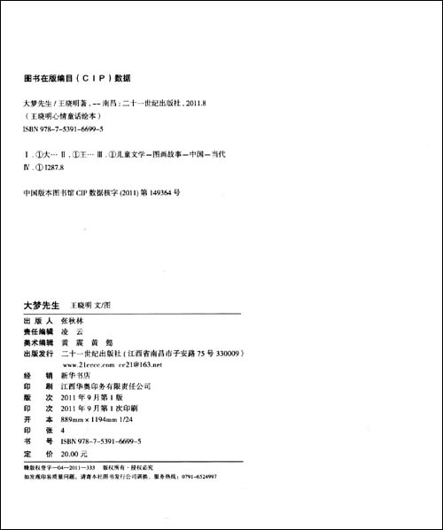 《王晓明心情童话绘本:大梦先生》《大梦先生》是著名童书画家兼作家王晓明先生的作品精选集,收入《鱼骨头蛋糕》《不开灯的屋子》《小人鱼和警察》《月光长廊》《大梦先生》《兔子钓牙医》《不寻常的瓶子》等作品。故事极具想象力,叙事或温润、或怪诞,构图或唯美、或夸张,具有较高的审美价值。