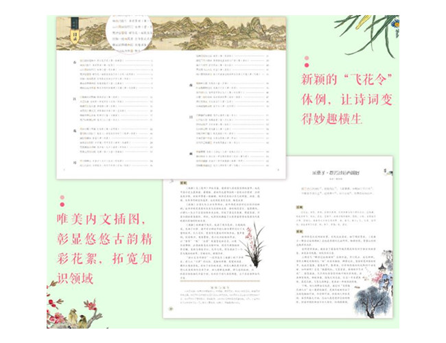 这是一部中国古典诗词的选集和注释,作者以诗词等韵文作为载体,从诗歌的缘起——《诗经》《楚辞》,到唐诗宋词,明清佳句,精心遴选了近500首经典古诗词,依循古代飞花令的行令规则以及现代人的阅读习惯,选取诗词中经常出现的春、夏、秋、冬、风、霜、雨、雪、花、云、月、夜等几十个常见字进行编排,每首诗词后均配有相应的注释与优美的文字赏析,有利于读者阅读和欣赏古典诗词,在学习和理解中领略古典诗词的博大精深。