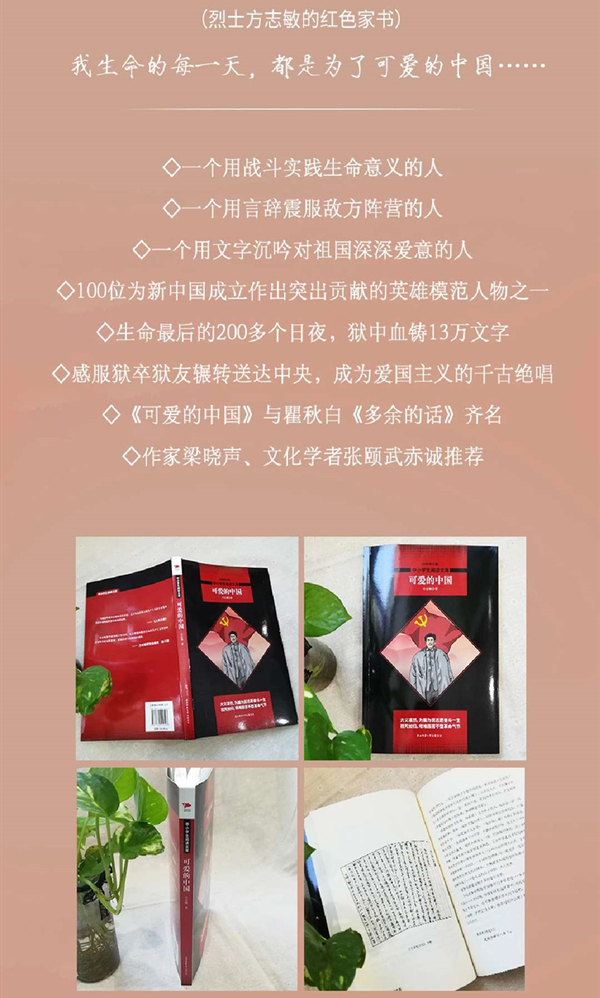 《可爱的中国》收录了方志敏烈士狱中完成的作品:《方志敏自述》《可爱的中国》《死》《清贫》《狱中纪实》《我从事革命斗争的略述》《在狱致全体同志书》《遗信》《记胡海、娄梦侠、谢名仁三同志的死》等。在国民党监狱中被囚禁约半年时间里,面对敌人的各种威逼和诱降,方志敏大义凛然,坚贞不屈,生命不息战斗不止,体现了共产党人的革命气节和崇高风范。文中洋溢着为国为民献身的爱国思想和爱国热情,表现出一个共产党员英勇无畏、视死如归的精神和意志。本书是对青少年和广大群众进行革命传统教育和爱国主义教育的不可多得的教材。