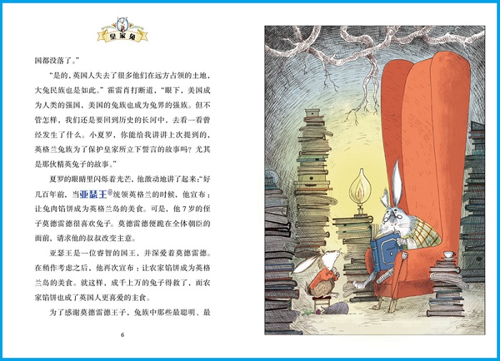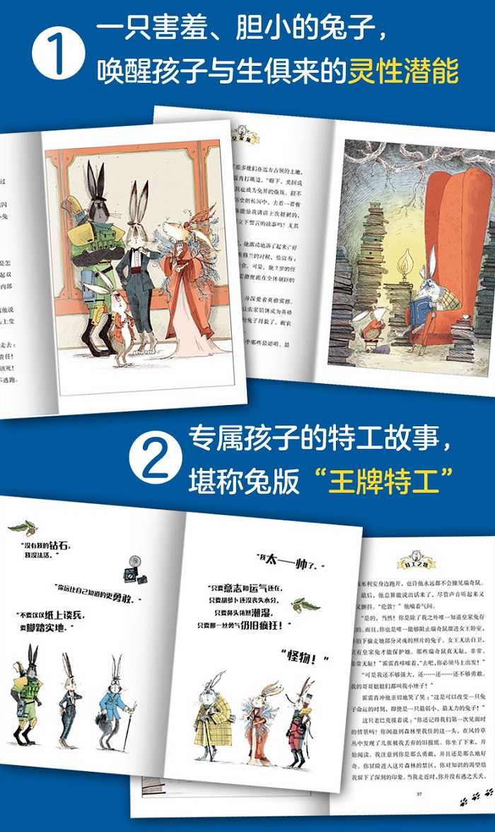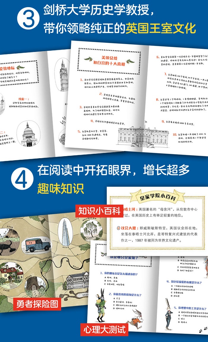 《耶路撒冷三千年》作家、英国皇家文学学会研究员、剑桥历史学家夫妇献给孩子的童心之作! 如果说英国文化中中国读者熟悉和喜爱的元素,莫过于英式特工和英国皇室,比如《007》、《憨豆特工》《王牌特工》,神秘、遥远的皇室也能触动人们的好奇心。而《皇家兔》正是这两者的结合。 《皇家兔》的故事灵感来自作家与儿子的一段对话。在成书的过程中,作家的一双儿女充当了*读者的角色,从读者的角度提供了很好的建议。 《皇家兔》系列具有以下特点: 1.专门为儿童创作的特工题材的幻想小说。这些特工是一群住在白金汉宫地下的兔子,肩负着保卫女王的重任。故事围绕一个弱小兔子成长为一名皇家兔的经历展开,情节跌宕起伏,扣人心弦,语言幽默诙谐,非常适合儿童阅读。 2. 这套书反映的是勇气、智慧、责任与合作的励志主题。*册的主题反映个体的勇气和智慧,突出英雄形象。第二册的主题上升为团队的合作和信任,强调个体的力量融入团队中,相互协作和信任,会变得更强大。书中反映主题的智慧语句用颜色区分标示可以作为小读者的语言积累。 3.作者之一是一名历史学家,擅长用历史学的方式和准确性讲述故事。他将幻想性动物故事置于现实的参照体系中,比如皇家兔渊源与英国历史,大兔地洞与白金汉宫,皇家兔模仿皇室的社交生活,动物世界与人类世界平行交叉,让读者感受到英国民族的文化历史和特性。 4.《皇家兔》呈现了英国独特的社会形态,人际交往特点,皇室风情,时尚传统,以及精英成长的心路历程,拓展孩子童年认知视野。作家夫妇与皇室的亲密关系,让读者在书中见到皇室的人文风貌,时尚文化传统,英国精英阶层的社交礼仪等等。更重要的是作家对历史上精英人物的研究成果,投射在书中主角夏罗心理成长的过程中。 5.这套系列将趣味性、知识性和游戏性融为一体。每章节后设置“皇家学院小百科”,针对书中提到的英国政治历史、时尚文化、人文科普进行专门的注解。书后有“测试你是哪只皇家兔”这样的游戏互动,让小读者在游戏中加深对人物的印象,还有“伦敦地标”“美国白宫十大真相”这类准确又难得的科普知识。 6.《皇家兔》具有IP价值,已被迪士尼抢购了电影版权。
