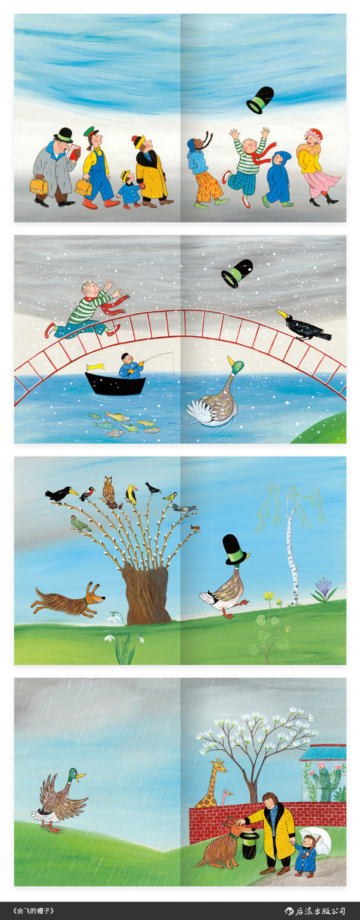一阵风吹来,将帽子从男孩头顶吹跑。男孩踏上了寻找帽子的旅途。他不知道,他的帽子已经飞过飘着雪的小河,飞过动物园,飞上了电车……在这一天里,帽子给很多的人和动物提供了温暖。傍晚时分,它又和男孩不期而遇。一阵风吹来,这次,男孩牢牢抓住了他的帽子,感受着失而复得的喜悦。
