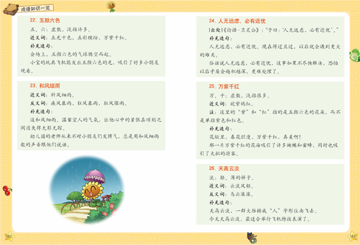 5.本系列图书囊括了人教版和苏教版小学1~6年级语文教材里收录的成语,并按照由易到难、由低年级到高年级的顺序进行编排。这样精心的设计实用、方便,非常适合小学生的实际需求。