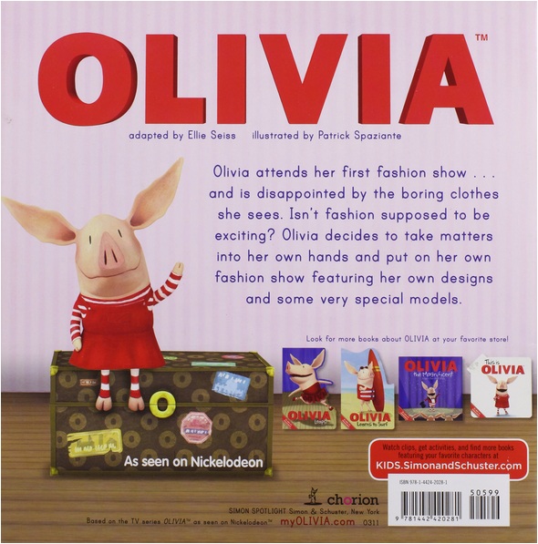 Olivia attends her first fashion show… and is disappointed by the boring clothes she sees. Isn’t fashion supposed to be exciting? Olivia decides to take matters into her own hands and put on her own fashion show, featuring her own designs and some very special models.