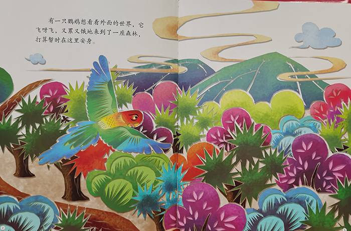 本书根据中国寓言故事改编而成,采用绘本的形式呈现,文图并茂,生动传神。《鹦鹉救火》的故事出自《宣验记》,原为宗教故事。这则寓言赞扬了朋友之间的友谊,体现了鹦鹉注重友情、知恩图报,虽然以一己之力不能救助朋友,但仍尽自己最大的力量去帮助朋友的美好品质。有一只鹦鹉飞到一座山上,和山中的飞禽走兽都相处很好,它们一起生活、一起玩耍,结下了深厚的友谊。时间一长,鹦鹉思念起自己的家乡来,于是向朋友们告别,大家洒泪相送、依依不舍。没过多久,山中突然燃起了大火,鹦鹉远远看见了,就飞入水中,沾湿自己的羽毛,又飞到山上,洒水灭火。天神说:“你根本救不了这场大火,弄不好会把自己的性命搭进去!”鹦鹉回答说:“即使我知道不能灭火,但这里所有的动物都是我的兄弟,我不忍心看它们被大火烧死啊!”天神很感动,就帮它熄灭了大火。