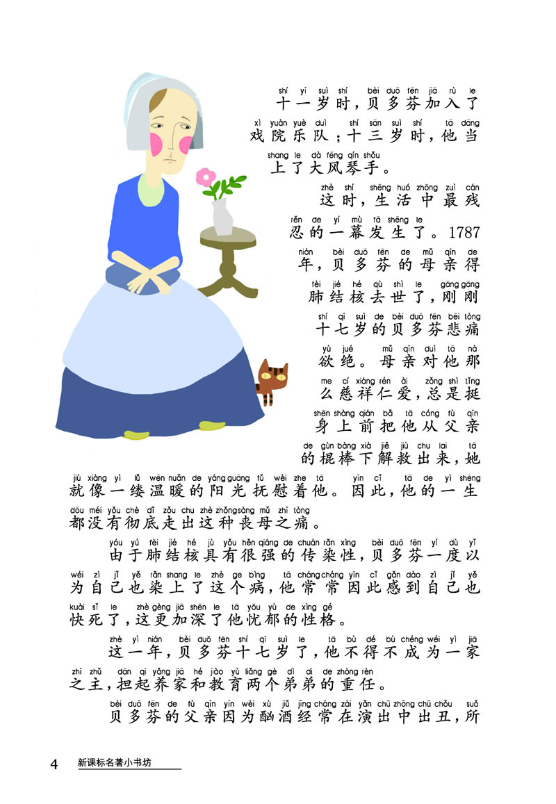 《新课标名著小书坊:名人传(注音版)》包括《贝多芬传》《米开朗基罗传》《托尔斯泰传》三部传记。在这三部传记中,罗曼·罗兰没有拘泥于对传主的生平做琐屑的考述,也没有一般性地追溯他们的创作历程,而是紧紧把握住这三位拥有各自领域的艺术家的共同之处,着力刻画了他们为追求真善美而长期忍受苦难的心路历程。罗曼·罗兰称他们为“英雄”,以感人肺腑的笔墨,写出了他们与命运抗争的崇高勇气和担荷全人类苦难的伟大情怀,可以说是为我们谱写了另一阕“英雄交响曲”。