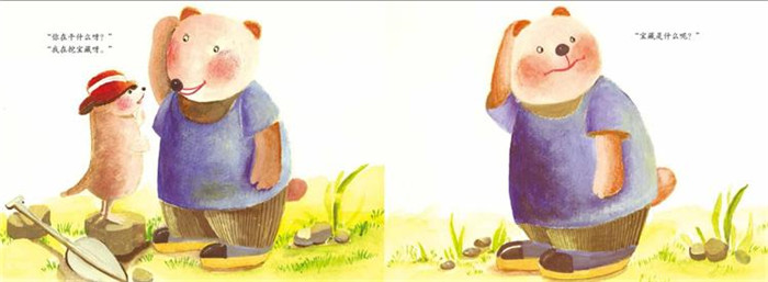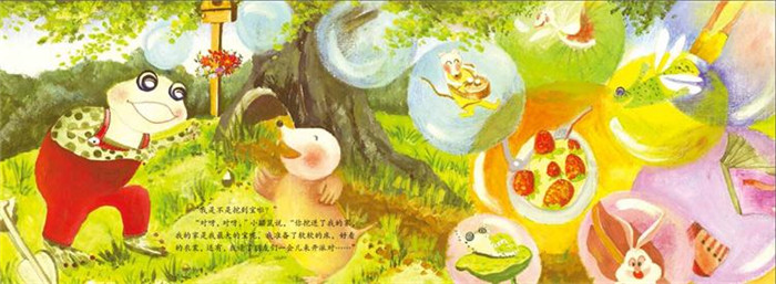 依米绘制的插画富有童趣,色彩饱满鲜艳,小动物形象栩栩如生,活泼可爱,符合幼儿的视觉审美。画面在准确表达文字内涵的同时,又丰富扩充了文字的外延,图文互映,极大地激发孩子的想象力,培养孩子审美情趣。
