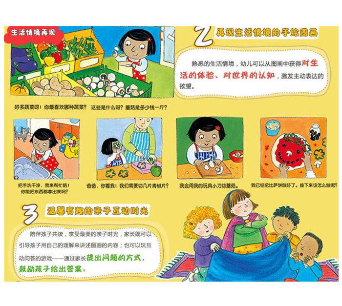 2. 书中的图画都是选取幼儿熟悉的生活情境,一幅幅图画连起来就是生活情境的再现。