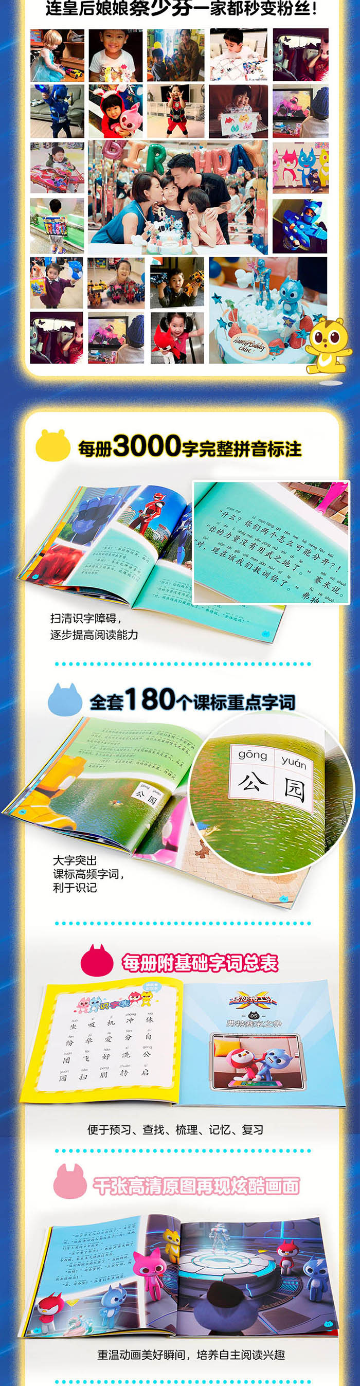 全套包含近千张精美高清动画原图,使用高阶细腻铜版纸印刷,逼真还原炫酷画质;故事与图片精心设计,画面感强,将人气动画固化于纸张,让阅读陪伴孩子成长。
