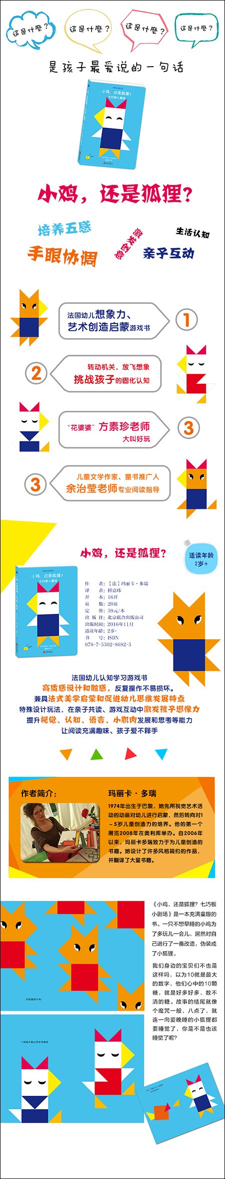 法国幼儿认知学习游戏书。高质感设计和触感,反复操作不易损坏。兼具法式美学启蒙和促进幼儿思维发展两大特点,拥有独特性和精致美感。特殊设计玩法,在亲子共读、游戏互动中激发孩子想像力,提升视觉、认知、语言、小肌肉发展和思考等能力,让阅读充满趣味、孩子爱不释手。