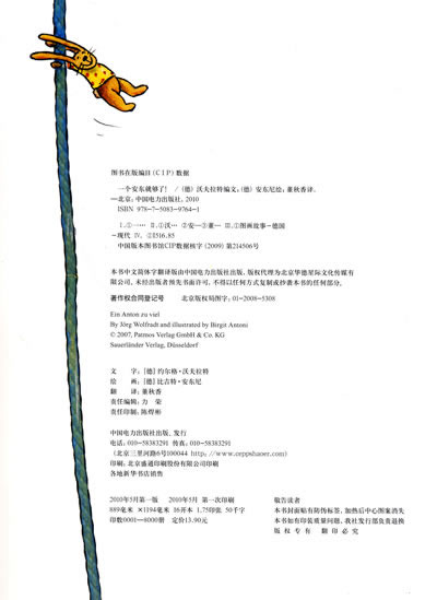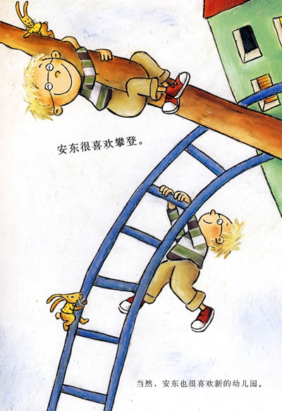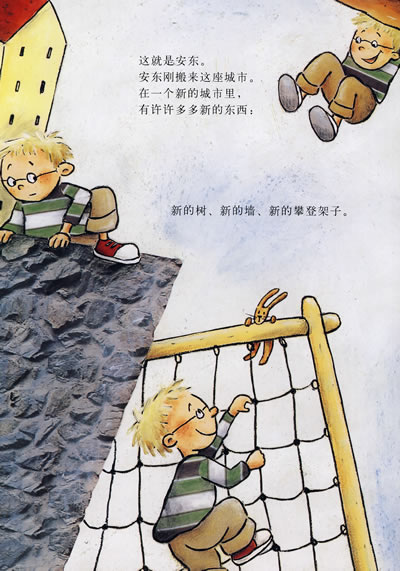 这就是安东。安东刚搬来这座城市。在一个新的城市里,有许许多多新的东西:新的树、新的墙、新的攀登架子。安东很喜欢攀登。当然,安东也很喜欢新的幼儿园。