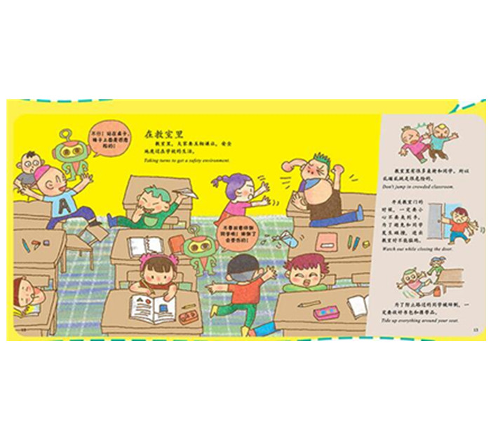 该系列图书分别从四个小朋友及其家庭的角度出发,从儿童的心理特点和理解能力考虑,围绕着户外活动安全、防诱拐、性侵、公共场所、学校安全等主题,多个主要的生活场景,以双语绘本的形式讲述了很多小主人公遇到的问题,每个问题的出现,都伴有解决方案和相关的知识点引申,语言和思考特点充分考虑小朋友的习惯,小读者能从中学会避开危险的人与事,遇险后保护自己的方法。