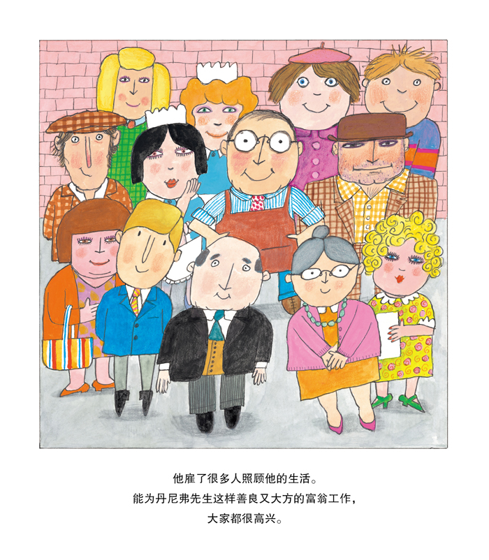丹尼弗先生是个大富翁,他住在伯顿小镇。他有自己的司机、园丁、厨师。大家都很高兴能为丹尼弗先生这样善良又大方的富翁工作。有一天,一个陌生人来到了伯顿镇,他懒惰又愤世嫉俗,挑拨镇上的贫民和丹尼弗先生之间的关系。丹尼弗并不介意,他把钱平分给了镇上的人,来到了马代尔小镇。他不停地画画,开心极了。他越来越有名气,画卖了很多很多钱。丹尼佛先生又成了大富翁。