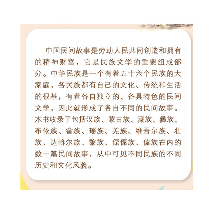 中国民间故事是劳动人民共同创造和拥有的精神财富,它是民族文学的重要组成部分。中华民族是一个有着五十六个民族的大家庭,各民族都有自己的文化、传统和生活的根基,有着各自独立的、各具特色的民间文学,因此就形成了各自不同的民间故事。本书收录了包括汉族、蒙古族、藏族、彝族、布依族、畲族、瑶族、羌族、维吾尔族、壮族、达斡尔族、黎族、傈僳族、傣族在内的数十篇民间故事,从中可见不同民族的不同历史和文化风貌。