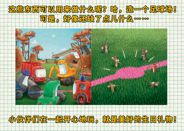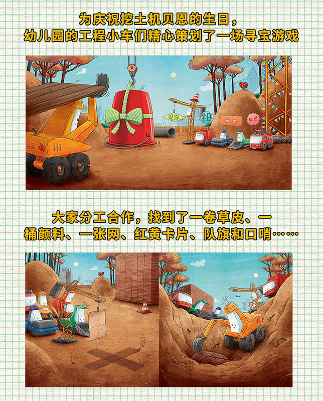 贝恩说:“谢谢大家,今天的生日真是太棒啦!” 为庆祝挖土机贝恩的生日, 幼儿园的工程小车们精心策划了一场寻宝游戏。 大家根据寻宝提示分工合作, 找到了一卷草皮、一桶颜料、一张网、红黄卡片、队旗和口哨…… 这些东西可以用来做什么呢?哈,造一个足球场! 可是,好像还缺了点儿什么…… 小伙伴们在一起开心地玩,就是美好的生日礼物! 显示部分信息