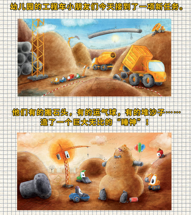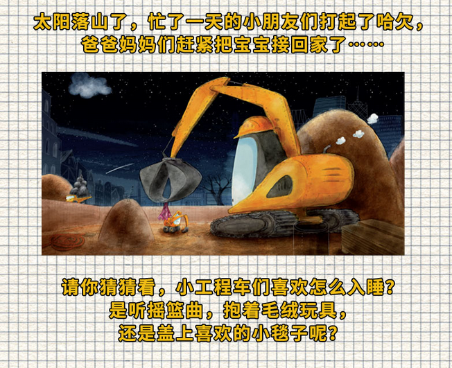 《晚安啦,挖土机贝恩!》 贝恩说:“看到这个沙子睡神,我就困了!” 幼儿园的工程车小朋友们今天接到了一项新任务。 他们有的搬石头,有的运气球,有的堆沙子…… 造了一个巨大无比的“睡神”! 太阳落山了,忙了一天的小朋友们打起了哈欠, 爸爸妈妈们赶紧把宝宝接回家了…… 请你猜猜看,小工程车们喜欢怎么入睡? 是听摇篮曲,抱着毛绒玩具,还是盖上喜欢的小毯子呢? 尽情玩耍,释放精力,在爸爸妈妈的陪伴中安心睡吧!