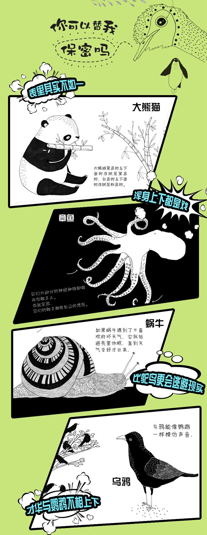 《你能替我保密吗》和玛雅•塞芙斯托姆的国籍瑞典一样,从黑白色调的趣味插画中,透出北欧外冷内暖的细腻情绪,配合精辟幽默的知识文字,幽默富有童趣,满足人们对于动物的好奇心,非常适合亲子共读。
