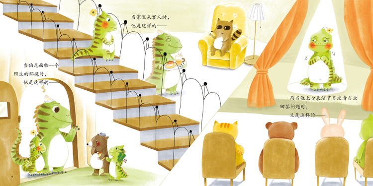 对于变色龙来说,爱害羞似乎有点糟糕。因为如果一只变色龙总是脸红,会很容易被敌人发现的!可伯尼就是这样,他该怎么办? 每个孩子的个性不同,对于爱害羞的孩子,家长不应过多责怪,而应该适当引导和鼓励,让孩子慢慢克服。
