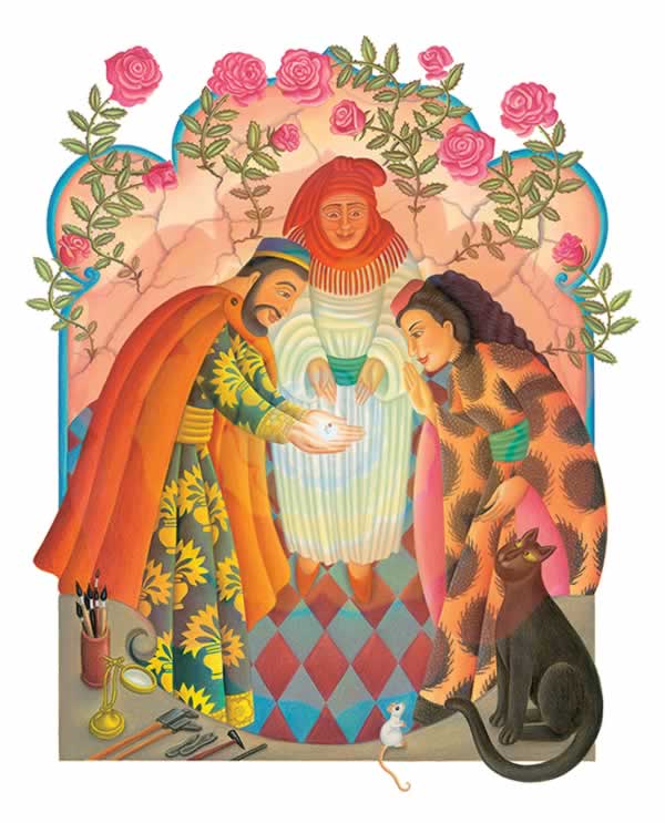 这一年过得很漫长。国王和公主都十分想念那颗钻石,也怀念钻石带给他们的欢乐时光,怀念从前,把钻石从盒子里拿出来,高高举在阳光下,看着彩虹在宫殿的墙上欢快地跳动。约定取钻石的一天终于到来了,这对父女动身去了老妇人作坊所在的村子。