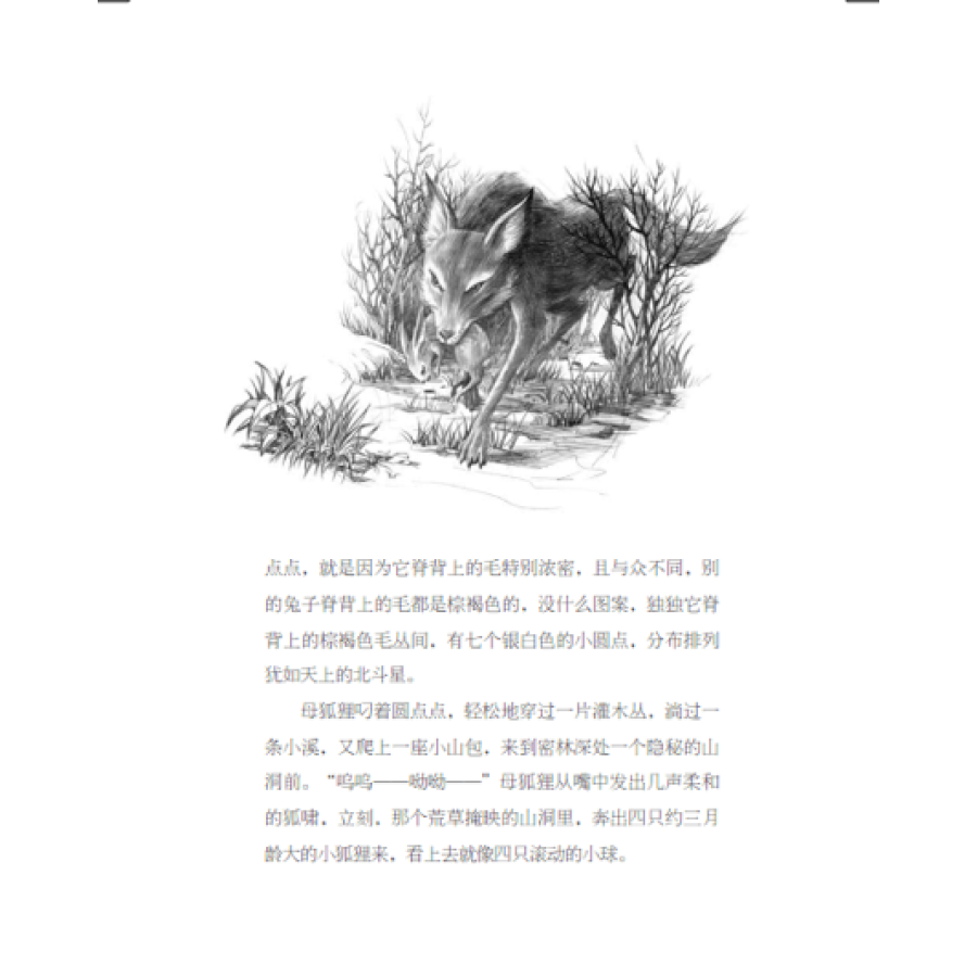 《兔王圆点点》:圆点点是一只狐口逃生的小兔子,它被小狐狸啃光了全身的兔毛,又被兄妹嫌弃,被妈妈抛弃,独自一人在阿斯特荒原孤独而又坚强地成长。它受过生活的磨难,正直善良,在同伴陷入困境时出手相助;它勇敢机灵,智斗凶残的红耳朵狐狸,击败狡猾的老鹰。*终,它赢得大家的拥戴,成为新一代兔王。