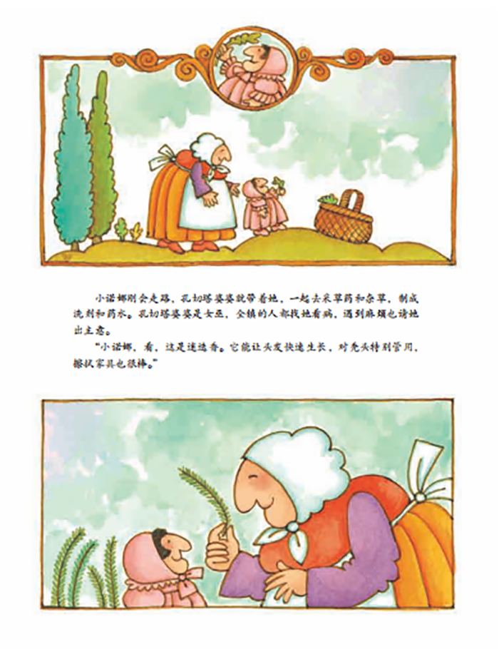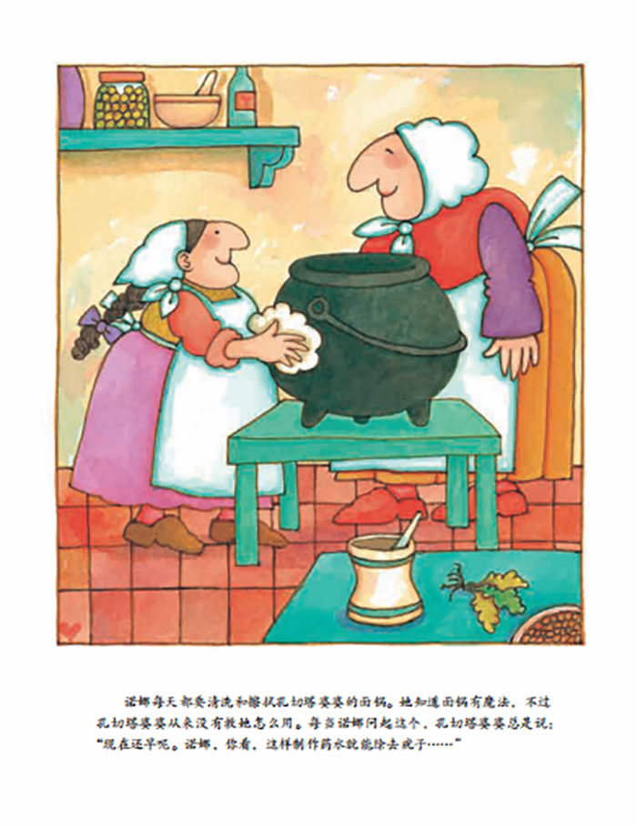 小诺娜喜欢和孔切塔婆婆一起生活,她学习到很多神奇的魔法,她长大后会像孔切塔婆婆一样,解决村民的病痛和烦恼,用神奇的面锅煮面。这本书是凯迪克大奖绘本《巫婆奶奶》的前传,看过巫婆奶奶的你一定不要错过哦。