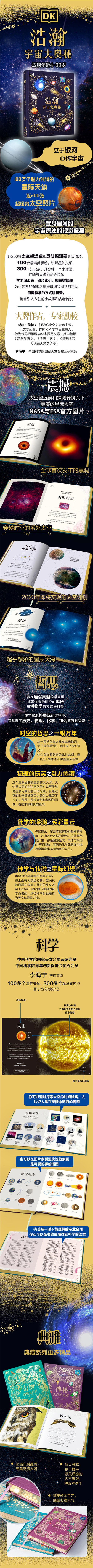 探索浩瀚的宇宙深处 几千年以来,人类一直仰望苍穹, 将无数梦境和想象寄托于广阔无垠的时空中。 从古巴比伦时期的北极光记录, 到飞越了阿克洛斯小行星的“新地平线号”, 充满未知的宇宙永远牵动着人类的心。 这本精致典雅的收藏集, 将100多个天体带到你的面前: 不仅有太阳系、银河系,还有距离我们8570光年的创生之柱。 还有很多寂静无声却又绚烂浩大的天文现象。 这次旅程,我们将前往遥远的星际, 我们将去探索,人类这一种族。 是如何成为星际探索者的。 立于银河, 心怀宇宙。