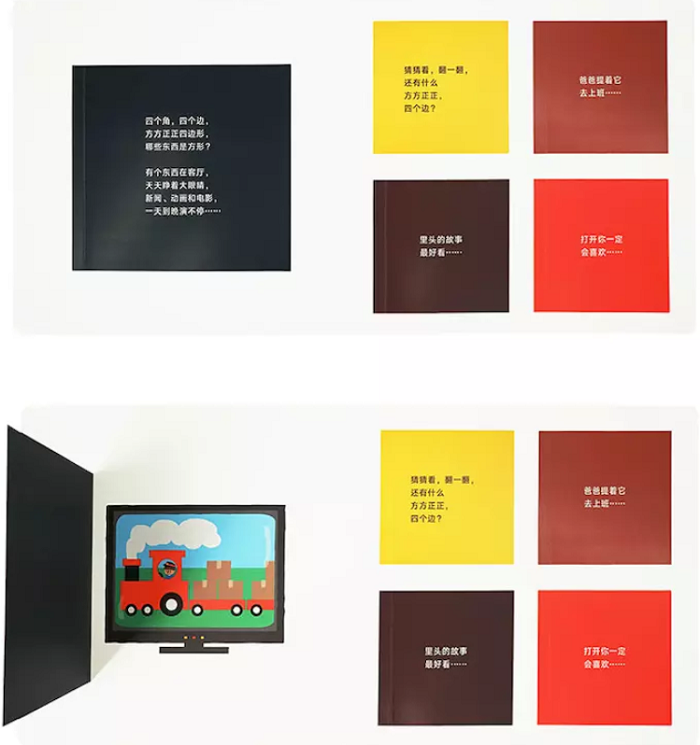 书中每页都有各种形状、大小、位置、颜色的区块可以揭开、抠开、掀开,翻开的卡片背后藏着歌谣中暗示的或让人出其不意的形象。