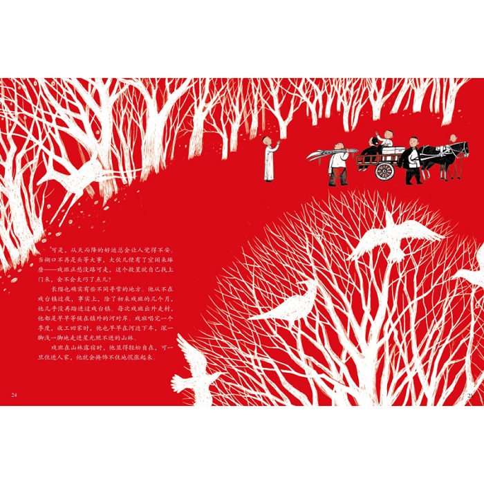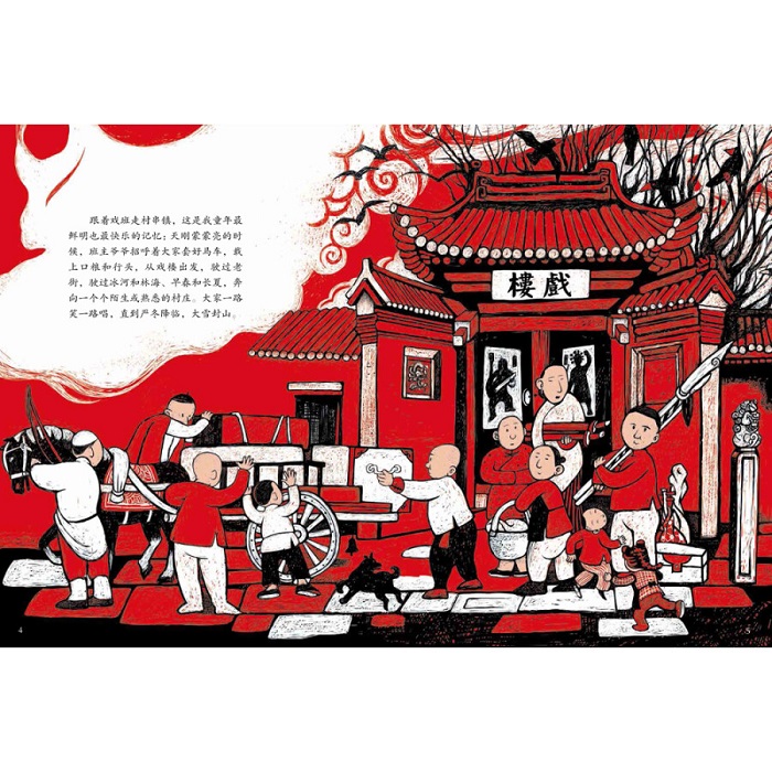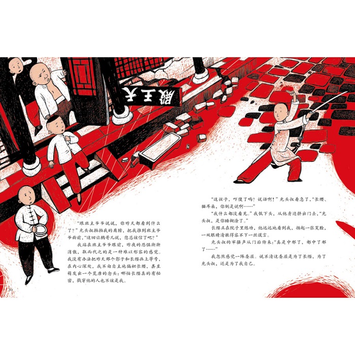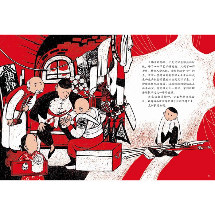本书讲述了戏痴猞猁化身为刀马旦圆梦的故事。 故事立意高远,充满对过往美好的怀念,读之让人忍不住落泪。 作家颜海婧以老戏台为媒介,塑造了一个热闹却又疏离、温暖却又寒冷的世界。故事依然是以人为主角,但不再是只有一个主人公,而是一个乡村戏班里的各色人等,生当净末丑轮番登场,上演了一出关于人性的大戏。故事中的“小神兽”——猞猁也与这些人产生了更多的互动,发生了更大的戏剧冲突,产生了震撼人心的效果。书中对长缨扮演的*美刀马旦的形象描写尤其精彩,让人被中国戏剧之美和长缨对戏曲表演的痴迷深深打动。 画家在表现这部作品时,想到的是流传于中国西北、*古老的戏剧之一——秦腔。秦腔口音中保留了较多古音,传说中,古音能召唤有灵性的野兽,《刀马旦》故事中的神秘少年长缨就是因为痴迷秦腔而幻化成人的猞猁。画家以粗犷朴拙的木板版画风格诠释这个故事,只使用黑白红三个颜色,以突出原始、单纯的感觉。 “木板刀刻出来,大红纸剪出来”,这样创作出来的画面充满了西北的民间味道,与行走江湖的戏班生活和苍凉高亢的秦腔相应和。