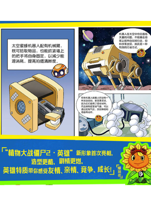 本套机器人漫画介绍机器人的发展历程、应用领域以及目前各领域拥有尖端技术的机器人(着重介绍与生活息息相关的领域)。将机器人相关知识融入欢乐、幽默、感人的冒险故事,让小读者在轻松阅读的同时,了解当前先进的科技和流行文化,唤起他们对机器人的好奇、思考与探索。《植物大战僵尸2机器人漫画·星际保卫战》一书主要介绍了太空机器人中的轨道机器人、远程呈现机器人、跳跃机器人、陪伴型机器人、软体机器人、太空采矿机器人、宇航员机器人有关知识