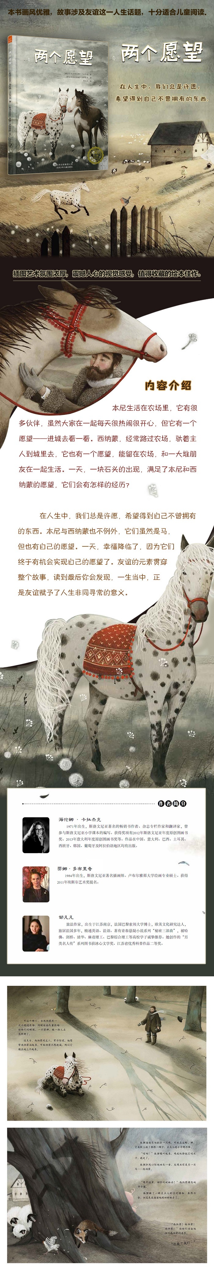在人生中,我们总是许愿,希望得到自己不曾拥有的东西。本尼与西纳蒙也不例外,它们虽然是马,但也有自己的愿望。一天,幸福降临了,因为它们终于有机会实现自己的愿望了。友谊的元素贯穿整个故事,读到*后你会发现,一生当中,正是友谊赋予了人生非同寻常的意义。