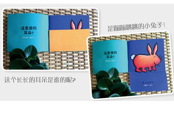 以《谁的尾巴?》为例,每页首先展示的是动物的尾巴部分,其身体和头部被折页盖住了。这是谁的尾巴呢?大人读出问题时,孩子可以先猜测,然后打开折页,露出完整的画面,于是辨认出动物。