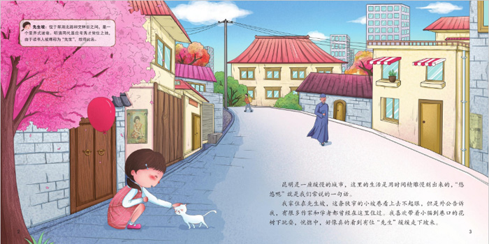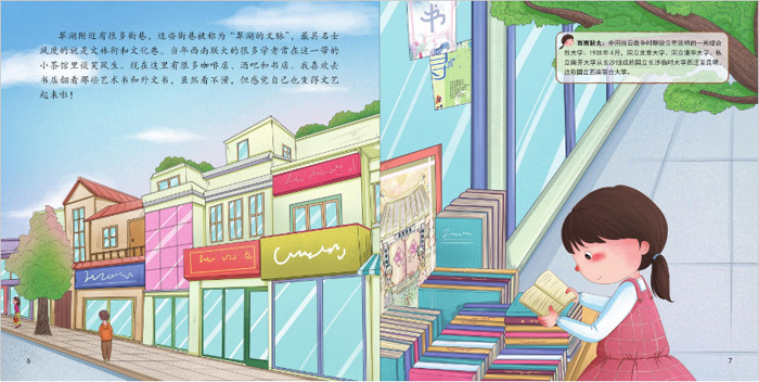 我们这套书分别讲述了哈尔滨、南京、成都、广州、昆明这五座著名的城市。通过居住在这些城市里的小孩小雪球、小梅妹、方方、麦克、悠悠的视角来讲述他们各自家乡的风土人情,例如吃食、建筑、风俗等等。