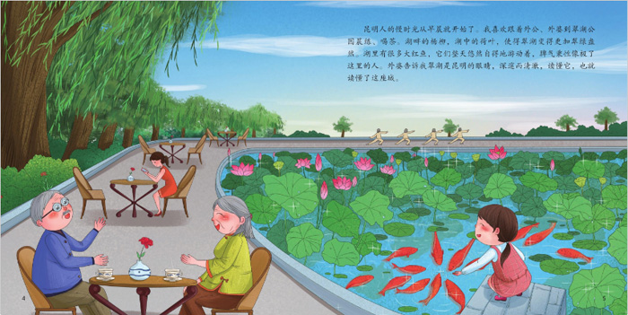 《七彩昆明》讲述了一位居住在昆明城区的小朋友悠悠的故事。悠悠的家在先生坡。早晨,她喜欢跟着外公、外婆到翠湖公园晨练,有时也会去文林街逛逛,这里有很多充满文艺气息的书店。她的妈妈在斗南市场工作,这里的花朵琳琅满目,色彩缤纷。三月她会和小伙伴们去圆通山玩儿,此时樱花、海棠花竞相开放,七月,会和外婆去石林参加火把节,十一月会去云南大学的银杏大道画画。深冬,去滇池喂红嘴鸥,元宵节去大观公园赏灯。昆明古老、神秘而又多姿多彩,这里有“一颗印”民居、官渡古镇、东川红土地……这这是一座缤纷多彩的城市。