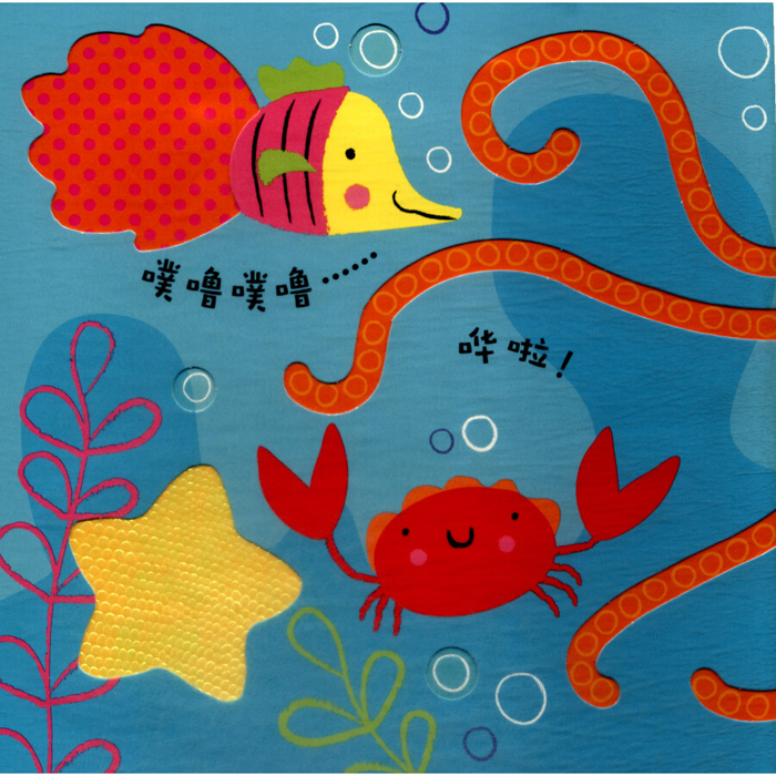 伸出小手摸一摸,摸摸白云朵,摸摸小翅膀,摸摸鱼儿的大尾巴,摸摸荷叶下的小青蛙……