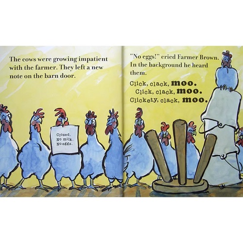 The quirky, hilarious farmyard tale that started it all from New York Times bestselling duo of Doreen Cronin and Betsy Lewin! Now the inspiration for a new Christmas special, CLICK, CLACK, MOO: Christmas on the Farm. Farmer Brown has a problem. His cows like to type. All day long he hears: Click, clack, moo. Click, clack, moo. Click, clack, moo. But Farmer Brown’s problems REALLY begin when his cows start leaving him notes! Come join the fun as a bunch of literate cows turn Farmer Brown’s farm upside-down!