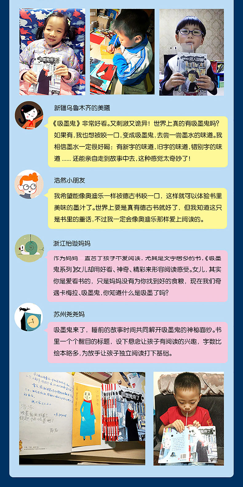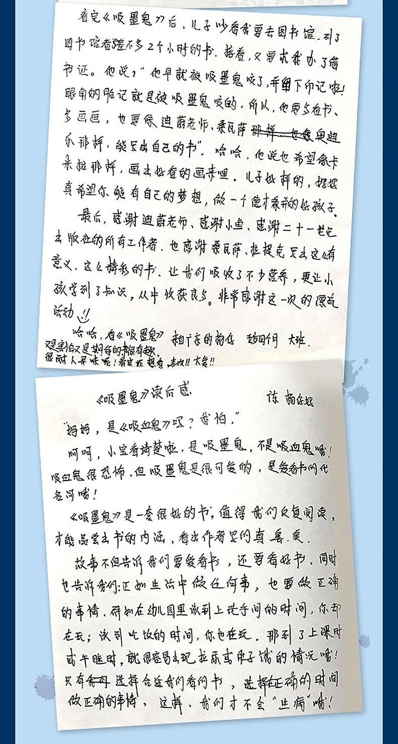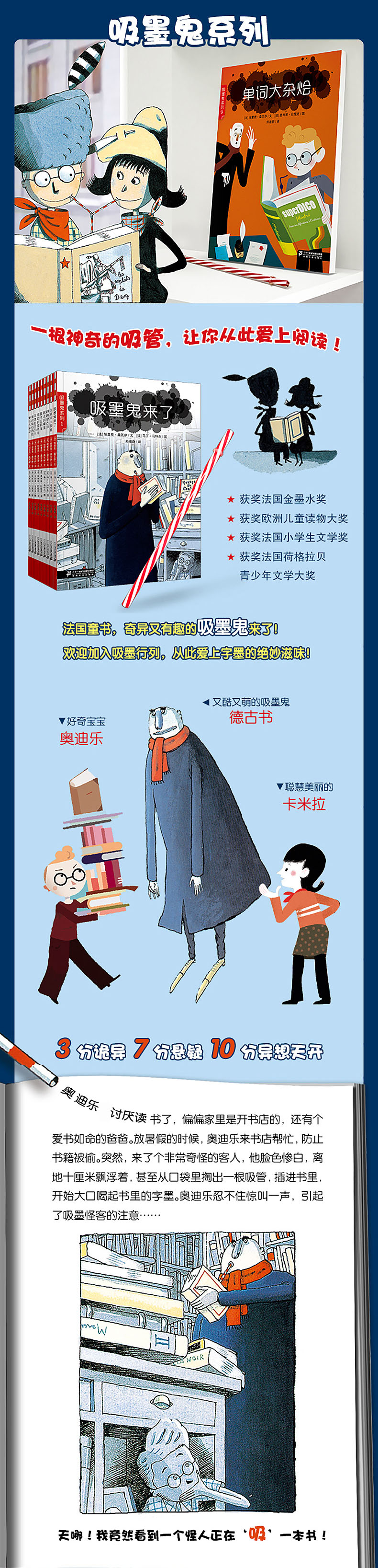 《吸墨鬼》系列,通过一个非常讨厌读书的孩子奥迪乐的奇特经历,展示各种不同类型的书籍对孩子心灵所产生的震撼,认识了大千世界所具有的无穷魅力。我们常用“你肚子里有多少墨水”,来质疑一个人知识的储备量,巧的是出自法国作家埃里克?桑瓦萨笔下的《吸墨鬼》系列,也把“读书”形象化为“吸墨”,大有异曲同工之妙。可见这是一部非常有趣、想象力超级活跃的丛书。