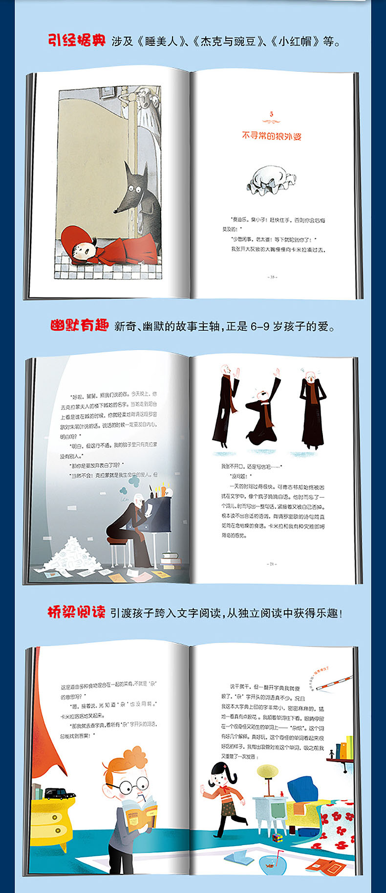 作者的表现手法绝不是呆板的说教,而是像魔术师一样使尽花招,将一个个情节夸张、诡异、悬奇,易读好读,充满别具匠心的创思的故事吸引人进入阅读世界……在故事中叙述故事;在情境中再创情境;诱人进入故事、进入文字、进入书,目不暇给地掉入一堆堆故事里,从而进入自己喜爱的书海去遨游,尽情享受那一个接一个的惊喜。最后,读故事的人不知不觉就变成故事中的角色。