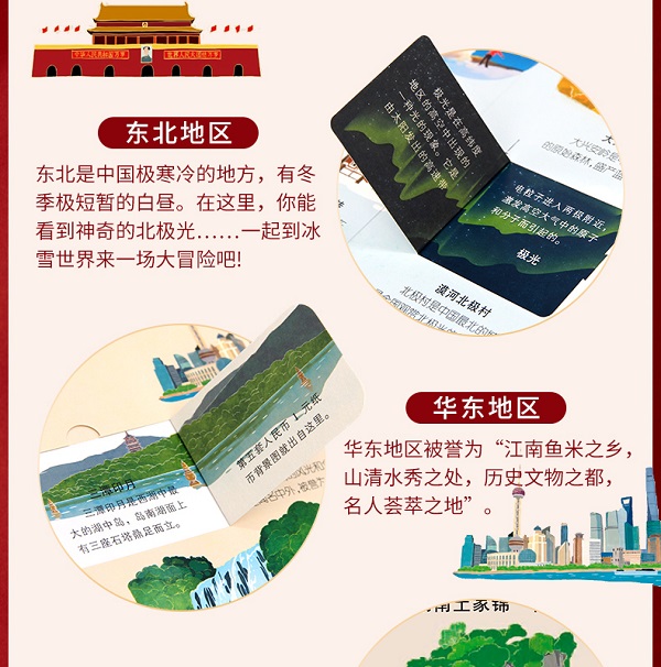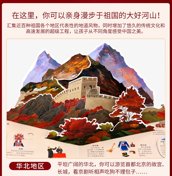 这是一本不用出家门就能让孩子看到伟大祖国的儿童百科知识立体书,它以百科般的地理知识为骨,生动有趣的手绘插画为翼,带领孩子在书卷中行万里路!书中将中国分为六大板块,鲜活呈现,一页就是一个地区的风土人情。以生动活泼的笔触和独特清爽的排版,将每个地方的概况、历史人物、地方特产、非物质文化遗产、历史事件、风景名胜以及动植物等表现得淋漓尽致,从各个角度系统地展现中国的自然与人文。
