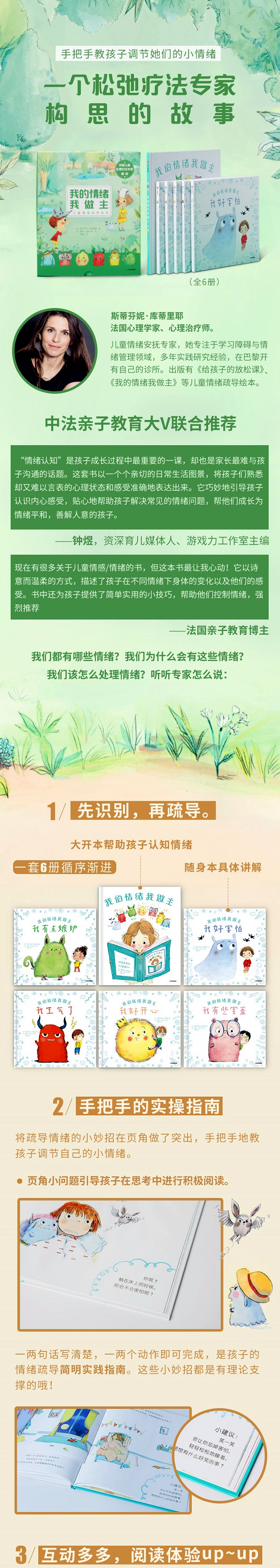 现在有很多关于儿童情感/情绪的书,但这本书*让我心动!它以诗意而温柔的方式描述了孩子在不同情绪下身体的变化以及他们的感受。书中还为孩子提供了简单实用的小技巧,帮助他们控制情绪。强烈推荐!——法国亲子教育博主 买给5岁的女儿,真的特别适合这个年龄的孩子!她平时会要求我这么做,有时候还会提醒我,要像书中所说的那样做,因为在书里可以找到消除恐惧和害羞等情绪的建议。非常好!——法国读者 为了给两岁半的儿子解释他面对的各种情绪买了这本书,他很喜欢。——法国读者 我认为这本《我的情绪我做主》和《情绪小怪兽》是我看过所有儿童情绪管理方面*好的。我和儿子都很喜欢这本。我觉得这些有趣的小技巧非常实用,也很好应用在孩子的日常生活里,比如通过呼吸释放愤怒。买这本书是想帮助孩子处理嫉妒的情绪,特别好,一点也没让我失望!——法国读者