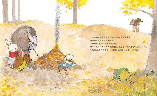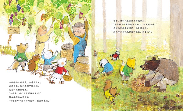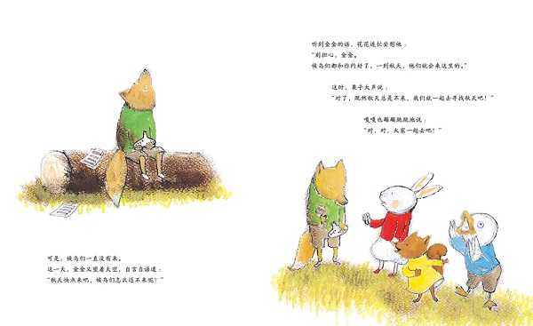 《秋日音乐会的约定》 住在冷杉公寓里的小狐狸平时爱吹笛子,有一次,他在吹笛子的时候和候鸟们做了一次约定,等到秋天,要为它们做一次音乐发表会。可是候鸟们不知道为什么迟迟不来。朋友们为了安慰小狐狸,一起出发去寻找秋天了。可是,秋天究竟在哪里呢? 一路上,大家遇到了不同的动物,明白了每种动物都有各自寻找秋天的办法,小狐狸决定听从老爷爷的话:就像等待成熟的果实一样,慢慢等待秋天是很重要的。
