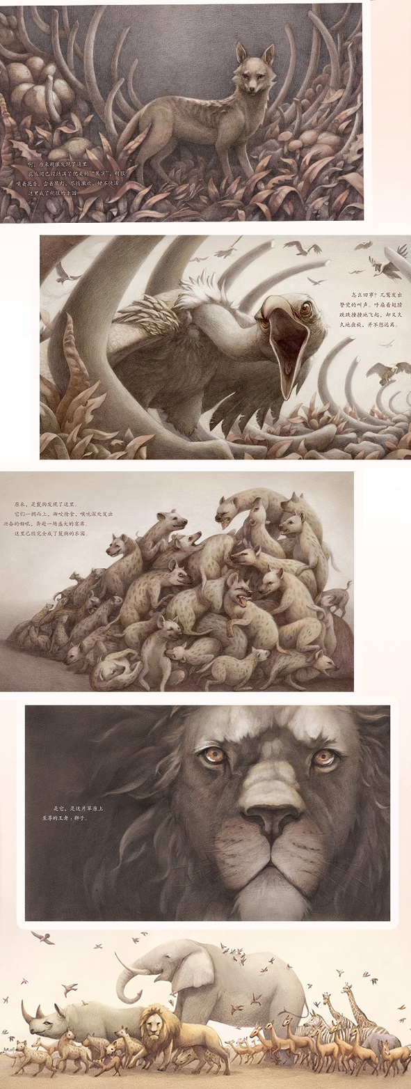 《读·乐园》 文/向 华(中央美术学院绘本创作工作室教学顾问、知名绘本作家、故事人、推广人) 非洲大草原是一个充满生命奇迹的地方,雨季和旱季交替,温柔和残酷并存,希望和绝望就像硬币的两面,随时随地会换上一副面孔。看似无尽循环的自然规律,其实都依附在时间箭头上义无反 顾地前行 。非洲大草原就像一座展现生命力量的舞台,当时间的大幕拉开,生命以不可思议的面貌轮番登场,形式可以千变万化,但是脚步从不会止歇。 姜楠描绘的是陆地上的哺乳动物大象的死亡,会吸引来各种各样以食腐为生的动物,享受这份免费的饕餮盛宴。这个景象如同另一个生命舞台大海中,当一头鲸鱼死亡后,鲸尸沉入海底,能够滋养数不清的底栖生物,从鱼类到虾蟹到蠕虫再到细菌,以至于在长达几年的时间内建立起一个复杂的生物群落,称为鲸落。大自然不会浪费任何资源,所有能够消化、能够分解的成分都会用来滋 养新的生命。不管是大海还是大草原,抑或是沙漠、沼泽、天空,这一幕一幕生死大戏,是地球上每天都在上演的狂欢。 姜楠正是被这出大剧所感动,敏锐地捕捉到能体现生生不息的剧情。她不想按照正常的时间顺序来讲述,而是将时间箭头翻转,把死亡的过程转化为创生的过程,从无到有,从死到生。小虫、鸟雀、胡狼、兀鹫、鬣狗、狮子......你方 唱罢我登场,后才将大象“谜底”揭示出来。当死去的大象摇摇晃晃地站起身,扬鼻长啸,生命的意义和分量瞬间增强。 时间重要的属性即是方向性,如同百川归海,奔腾不息。翻转时间箭头需 要技巧,更需要勇气。经过姜楠艺术处理后的生命乐园,既向我们展现了难以置 信的戏剧性,也让我们震撼于生命的顽强。当我们读罢绘本《乐园》,已然成为 生命舞台前一名忠实的观众。 《自然之道,周而复始,生生不息》 文/何 鑫(生态学博士,上海自然博物馆自然史研究中心研究人员) 在许多人的印象中,提起野生动物世界,脑海中首先闪现的场景 一定包括广阔无垠的非洲大草原。在我们所赖以生存的这颗星球上,只有这片神奇的大陆,直到今天仍然是众多大型陆生野生动物的乐园。 在这里,非洲草原象无疑是其中代表性的动物,它们的身体是如此高大而雄伟,灵活矫捷的长鼻和壮观威武的象牙更使得它们成为非洲大陆自然与野性独一无二的象征。若我们有机会在野外面对它 们伟岸的身躯,与那深邃的眼神相对时,定然能深深地感受到大自然 所蕴含的力量。 所谓万物之灵长的人类,我们在自然界真的处于那个无与伦比的 统治地位吗? 大自然,万物循环往复,周而复始。当大象终于自然老去而轰然 倒下时,那些在草原上曾经仰望它身影的动物们会有怎样的思绪?《乐园》带给了我们一则美丽的故事,在大象的身躯背后,虫子、鸟儿、胡狼、 兀鹫、鬣狗、狮子纷至沓来,共享着自然生态的微妙平衡。 在我们的心中,作为人类祖先诞生地的非洲大陆,自始至终都拥有这样神奇的魔力,因为这里的大型动物们并未因为数万年来人类的所作所为而消失。而其他的大陆,无论是更为广阔的亚欧大陆,还是人类崭新踏足的美洲大陆,亦或者远隔重洋的大洋洲,人类的影响早已无所不至,那里曾经生存过的众多身 形巨大的生灵或多或少因此而走入地球记忆的历史中。 真正自由自在的野生动物世界,也许除了冰天雪地的南极,只剩下壮阔的非洲 大草原了吧。在这里,在乞力马扎罗山的雪峰下,在塞伦盖蒂和马赛马拉的旱雨 两季交替之间,大自然仍然滋养着如今这片世界上为壮观的野生动物乐园。数 百万头角马和斑马群在草场间辗转迁移,追赶着雨水滋养的生机。而在它们身后,非洲狮、豹、猎豹、斑鬣狗、黑背胡狼这些秀的捕食者,施展着精妙的捕 猎技巧,维护着这颗星球基本的自然准则 :捕食者和猎物永远你追我赶的演化平衡。 在这其中,大象,这个动物世界中富有代表性的图腾,作为这本《乐园》的主角再合适不过了。一个动物个体的自然逝去并不代表悲伤,反而是生命的一个新的开端。正如文中所言,大自然的神奇在于 :“生命之间彼此汲取,彼此奉献, 生生不息,永无止境。大自然是所有生命的乐园!”而守卫这样的家园,与万千 生命和谐共存,是我们人类需要努力的方向!