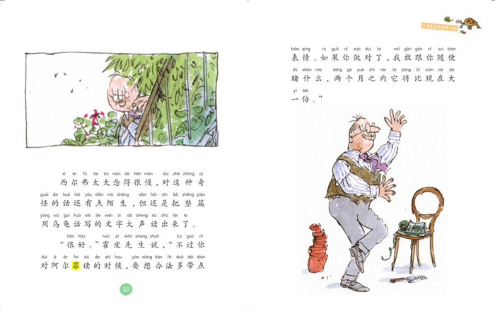 《罗尔德•达尔作品典藏(彩图拼音版)》是一套专门针对5-8岁孩子推出的拼音版读物,首批推出《了不起的狐狸爸爸》《蠢特夫妇》《小乔治的神奇魔药》《魔法手指》《小乌龟是怎样变大的》五种。达尔的作品深受全世界孩子们的喜欢,在中国销售超过2000万册。“彩图拼音版”故事构思奇特,情节紧凑,结局出人意料,其魔力穿越语言和国界;内文加注拼音,为孩子扫清阅读障碍;彩图由世界插画大师昆汀·布莱克绘制,四色彩图印刷,制作精良,更符合5-8岁孩子的认知和审美。这套书适合小学低年级孩子阅读,是让孩子喜欢书籍、爱上阅读的优质童年读物。 孤独的霍皮先生有两个心头之爱:一个是他种在阳台上的花,一个是住在楼下的寡妇西尓弗太太。可西尓弗太太眼里只有她那只小乌龟阿尔菲,这让霍皮先生有点难办。后来,霍皮先生想出了一个无与伦比的计划——把阿尔菲“养”得更强更大。于是,一切都随之发生了改变……故事诙谐幽默,情节引人入胜,语言通俗易懂,展示了达尔优秀的文学想象力,能够让小读者获得精彩的阅读体验。