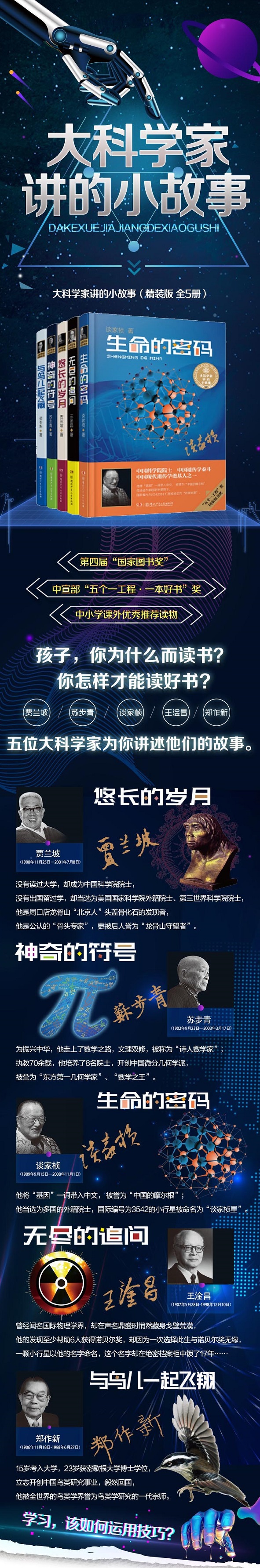这是一套大科学家为青少年写的书。这些大科学家走过近一个世纪的人生历程。他们用平实而睿智的文字,讲述了自己一生求学、科研和做人的故事。从中我们能看到他们奋斗的历程,几十年来中国科学发展的历史,以及科学家热爱祖国、无私奉献的精神。 在这近一个世纪里,我国的科技迅猛发展,他们无疑是奠定了中国现代化科学发展基石的大科学家,他们用亲切的笔触记录下那个时代背景下拼搏的一代人是怎样的伟大,如今的青年人不应该忘记他们,应该从他们身上看到一种精神的传承。 本这套书一共5册,分别是《悠长的岁月》《神奇的符号》《生命的密码》《与鸟儿一起飞翔》《无尽的追问》。 这是中国**的科学家们为青少年送上的一份珍贵礼物,他们用平实而睿智的文字,讲述了自己求学、科研、为人处世的小故事,期望青少年能够从中汲取面对未知的好奇、追逐梦想的激情、拥抱生活的热情、直面坎坷的勇气、击败困难的力量! 少年智,则中国智!少年强,则中国强!