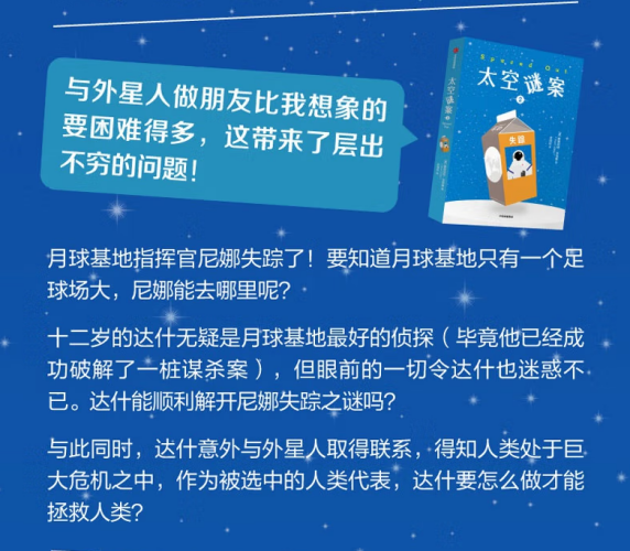 月球基地指挥官尼娜失踪了! 要知道月球基地只有一个足球场大,尼娜能去哪里呢? 十二岁的达什无疑是月球基地最好的侦探(毕竟他已经成功破解了一桩谋杀案),但眼前的一切令达什也迷惑不已。达什能顺利解开尼娜失踪之谜吗? 与此同时,达什意外与外星人取得联系,得知人类处于巨大危机之中,作为被选中的人类代表,达什要怎么做才能拯救人类?