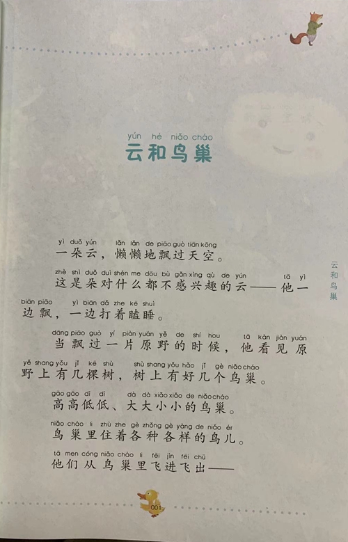 yún hé niǎo cháo 云和鸟巢 yì duǒ yún lǎn lǎn de piāo guò tiān kōng 一朵云,懒懒地飘过天空。 zhè shi duǒ duì shón me dou bù gǎn xing qù de yún tā yì 这是朵对什么都不感兴趣的云--他一 biān piāo yi biān dǎ zhe kē shui 边飘,一边打着瞌睡。 dang piāo guò y piàn yuán yě de shí hou tā kàn jiàn yuán 当飘过一片原野的时候,他看见原 yě shang yǒu jī kē shù shù shang yu hǎo jī gèniǎo cháo 野上有几棵树,树上有好几个鸟巢。 gāo gāo di di dà dà xiǎo xiǎo de niǎocháo 高高低低、大大小小的鸟巢。 niǎo cháo i zhù zhe gè zhng gè yàng de niǎo ér鸟巢里住着各种各样的鸟儿。 tā men cóng niǎo cháo i ei jin tei chū 他们从鸟巢里飞进飞出