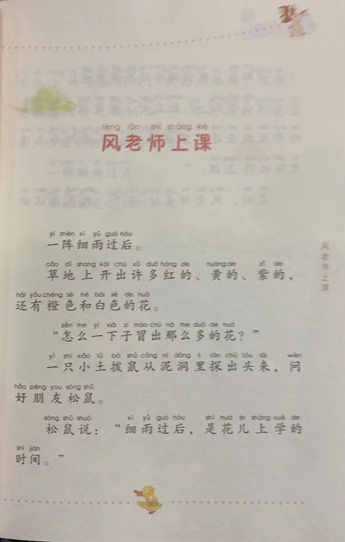 风老师上课 yi zhen zi yh guo hou 一阵细雨过后。 coo dishong k choniduo hóngde huang de zde 草地上开出许多红的、黄的、紫的, hai yöucheng sehebo sede tua还有橙色和白色的花。 zen me yx moo cha n me dus de tu5 “怎么一下子冒出那么多的花?" yì zhi xiǎo bó sùcóngidàng n ch tóus 一只小土拨鼠从泥洞里探出头来,问 hǎo péng you song sti好朋友松鼠。 sǎng shü shuò xi yǔ guò hóu shl hud er snong xe de 松鼠说:“细雨过后,是花儿上学的 sijian 时间。”