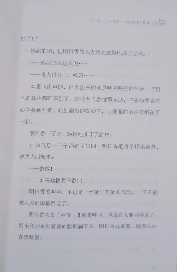 “你哟,没生你就好了!”明日香11 岁的生日就在哥哥这样刺人心肺的感叹中到来。虽然她在哥哥的嘲讽中小心翼翼地期待,但妈妈还是没记住明日香的生日,甚至说:“唉唉,要是没生明日香就好了。”“谁来救救明日香?”在妈妈的躲躲闪闪和冷漠忽视下成长的明日香,幼小的心灵备受折磨,终于承受不住,她失去了声音。醒悟过来的哥哥帮助她躲到了外祖父母所在的乡下。在善良的老师、慈爱的外祖父母的鼓励和关爱下,明日香还能够找回生存的希望和勇气,重新发出声音吗?